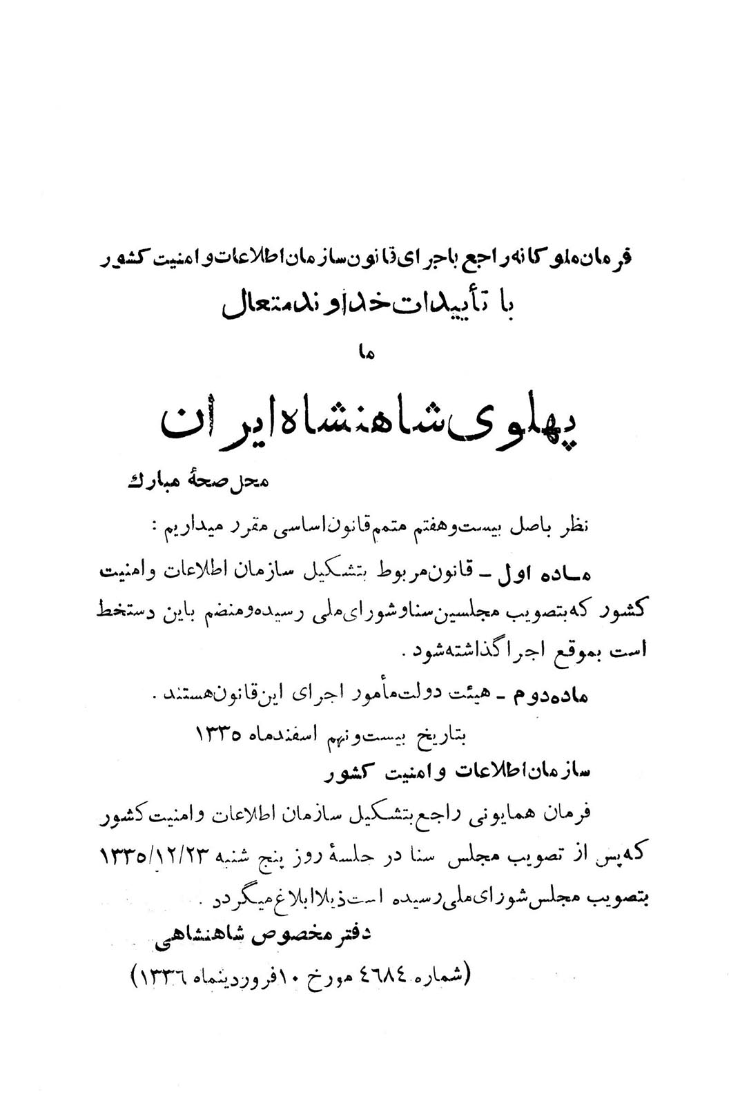 این سند شامل متن کامل قانونی است که به تأسیس و تعریف حدود اختیارات سازمان اطلاعات و امنیت کشور (ساواک) در دوره پهلوی میپردازد. این قانون، چارچوب حقوقی و سازمانی این نهاد امنیتی را تبیین میکند.