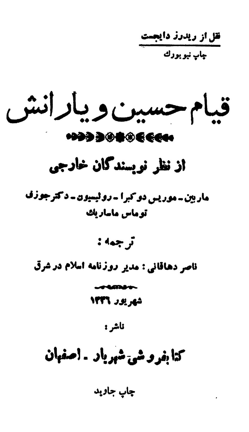 🔖 book_keywords : دانلود فایل pdf قیام حسین و یارانش از نظر نویسندگان خارجی نوشته مجله ریدرز دایجست ترجمه ناصر دهاقانی