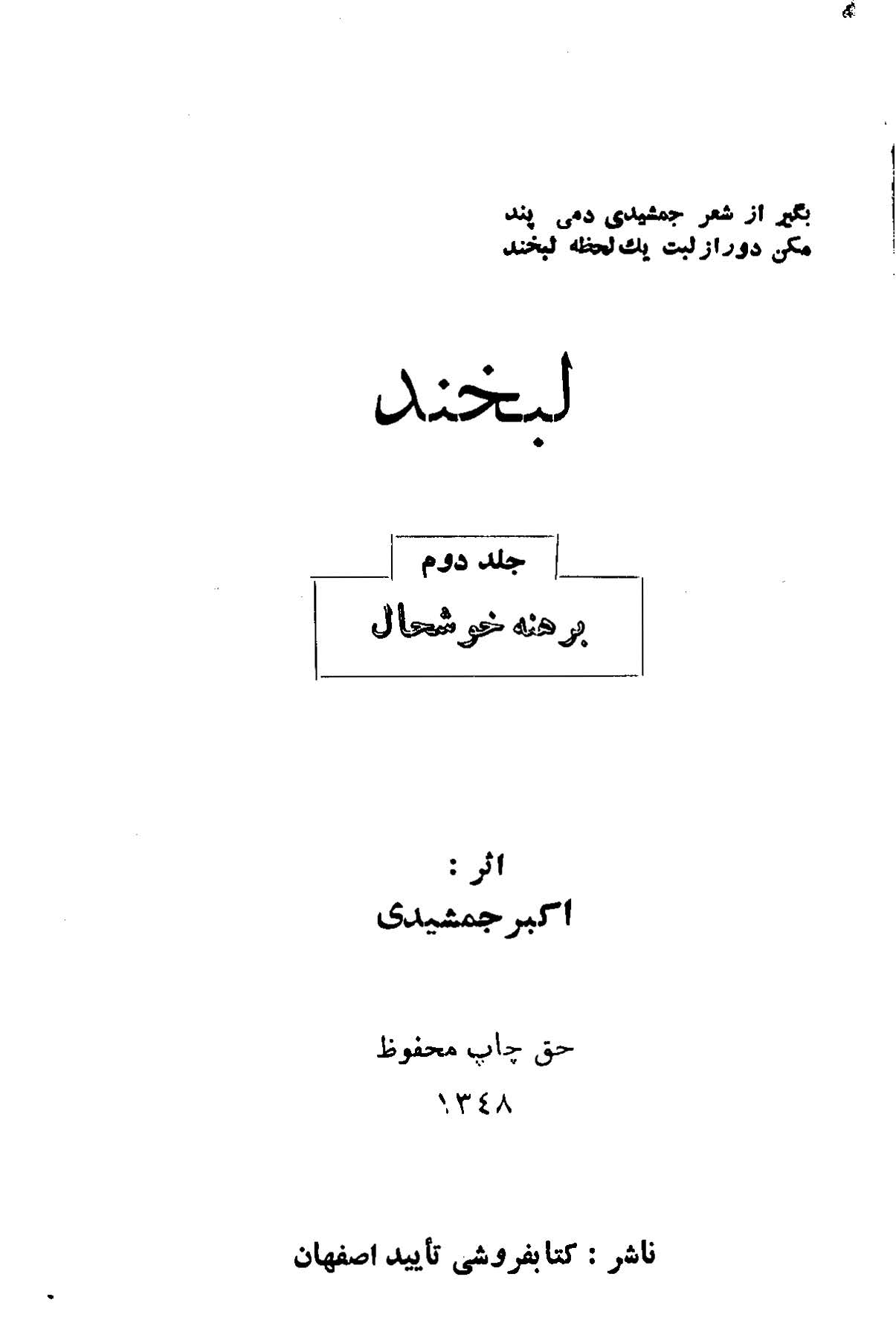 موضوع کتاب لبخند، جلد دوم (برهنه خوشحال) شعرهایی است اکبر جمشیدی مولف کتاب در سال ۱۳۴۸ توسط کتابفروشی تایید اصفهان منتشر کرده است