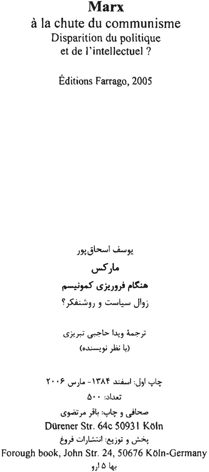 🔖 book_keywords : دانلود فایل pdf مارکس هنگام فروریزی کمونیسم: زوال سیاست و روشنفکر؟ نوشته یوسف اسحاق پور ترجمه ویدا حاجبی تبریزی