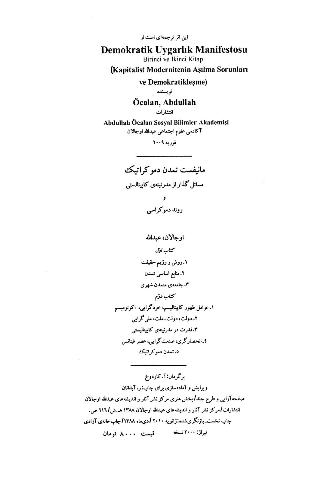 «مرکز نشر آثار و اندیشههای عبدالله اوجلان» برای سهولت در دسترسی و مطالعهی منسجمتر مخاطبان عزیز، تصمیم برآن گرفت که هر یک از دفاعیات پنجگانه و مستقل را گردآوری و ویراش دوباره نماید و در قالب دورهی کامل پنج جلدی تحت عنوان «مانیفست تمدن دموکراتیک» به مخاطبان ارائه نماید.