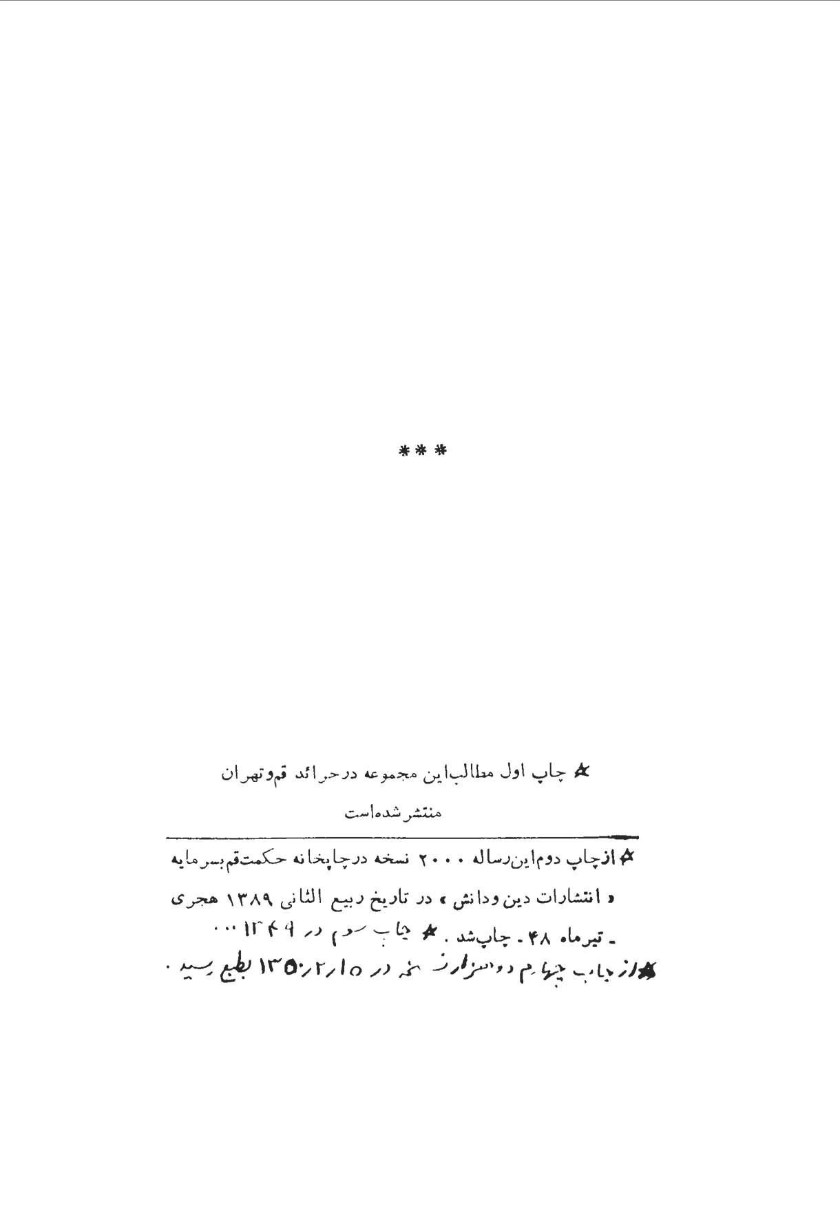 مجموعه این مقالات برای بار چهارم در جده عربستان سعودی به چاپ رسیده و ما آنها را از روی متن عربی چاپ جده، به فارسی ترجمه کرده ایم که قسمتی از آنها از دو سال پیش در پاره ای از روزنامه های قم و تهران به امضای ابوصالح منتشر گردید…