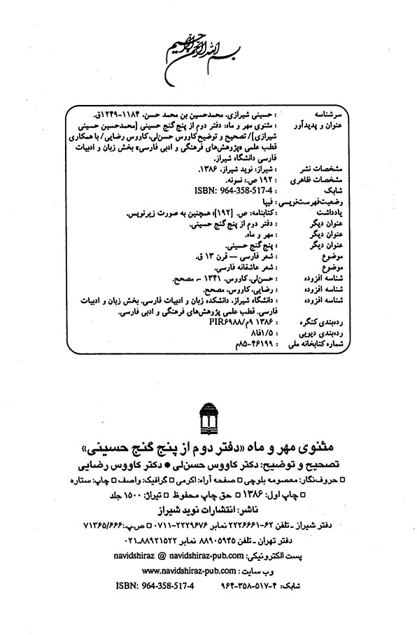 🔖 book_keywords : دانلود فایل pdf مثنوی مهر و ماه نوشته محمدحسین بن محمدحسن حسینی شیرازی ترجمه مصحح: کاووس حسنلی, کاووس رضایی