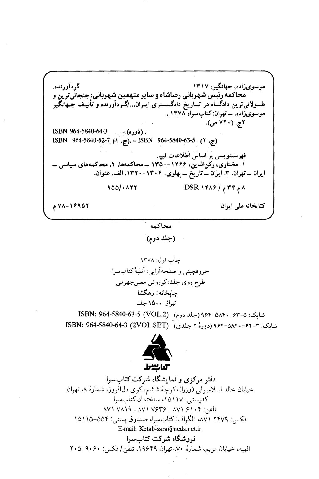 🔖 book_keywords : دانلود فایل pdf محاکمه رضا شاه در برابر تاریخ: محاکمه رئیس شهربانی رضاشاه و سایر متهمین شهربانی: شامل ۴۴…. (جلد ۲) نوشته جهانگیر موسویزاده