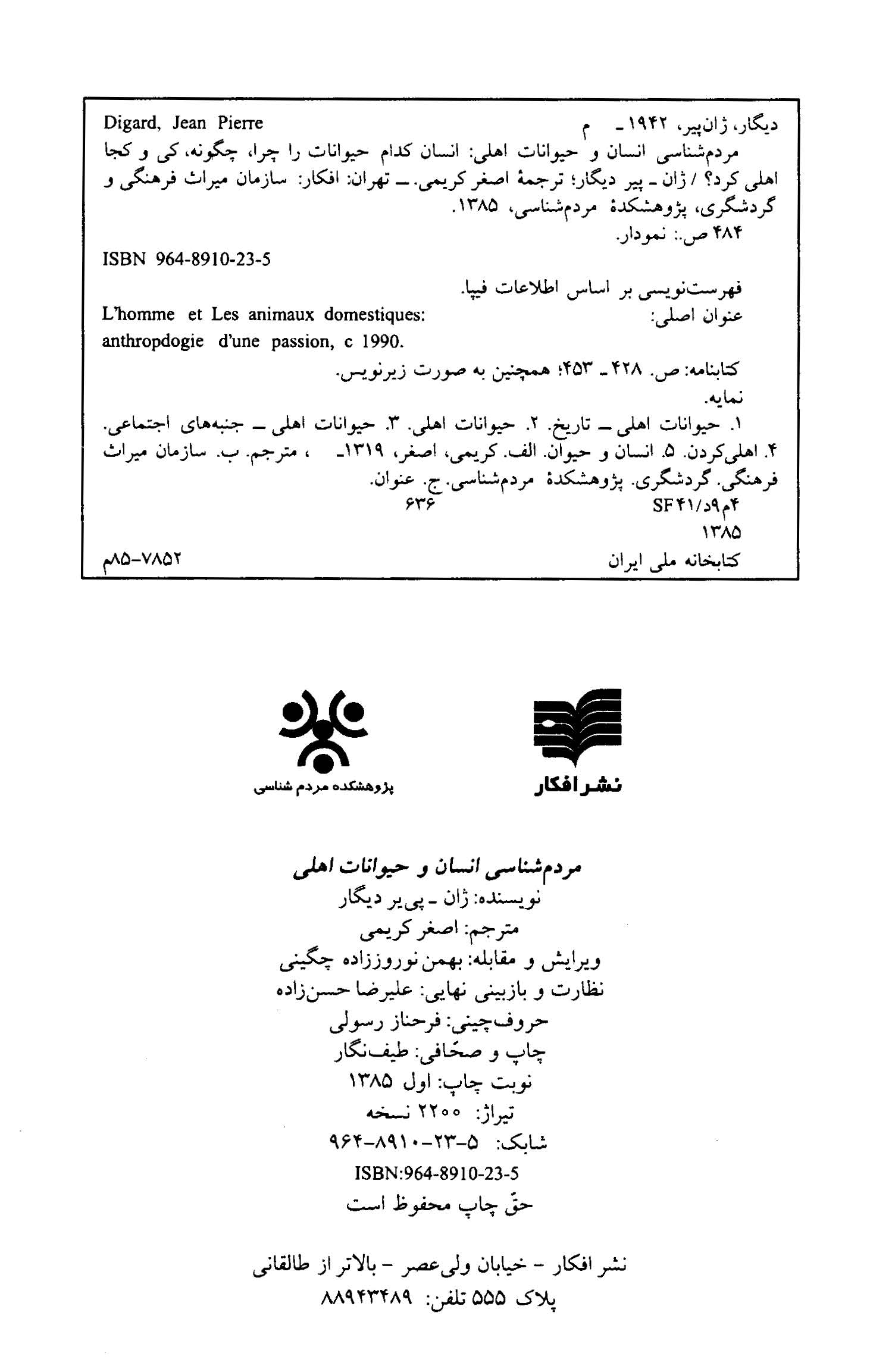 یادداشت عنوان روی جلد: انسان و حیوان: مردم‌شناسی انسان و حیوانات اهلی.