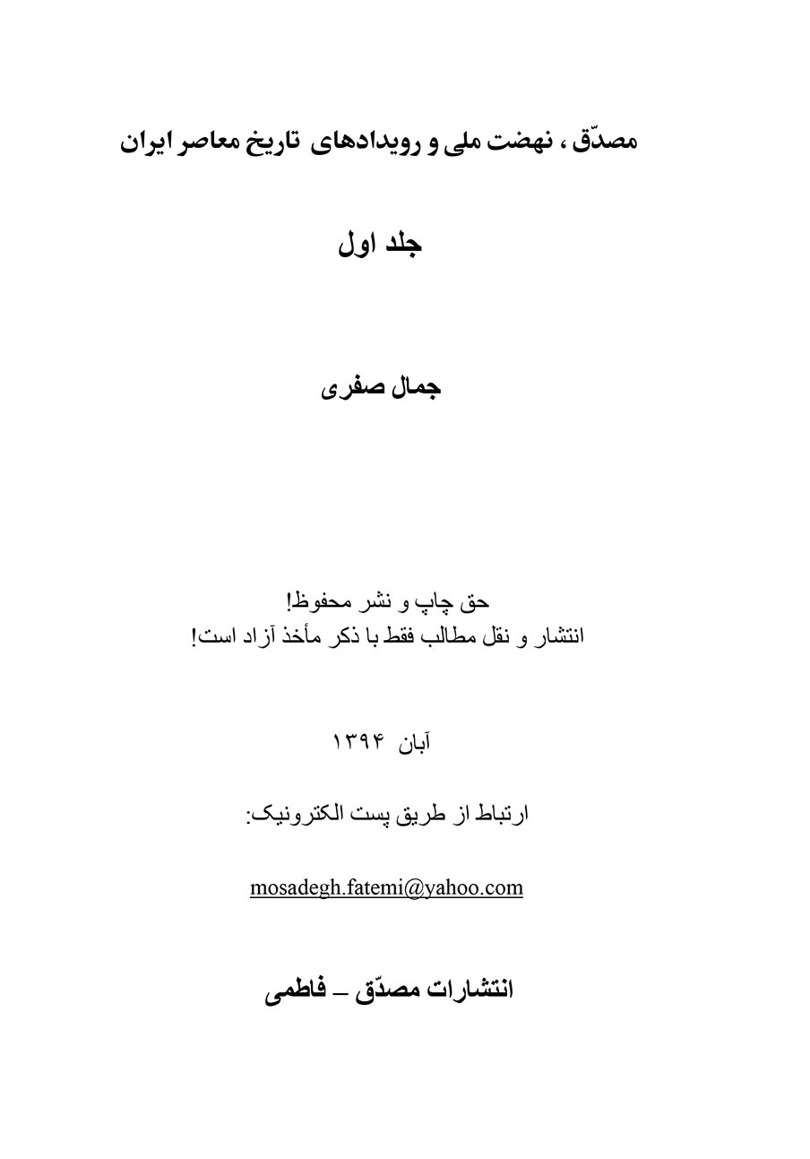 جلد اول کتاب تاریخ معاصر ایران تحت عنوان « مصدق، نهضت ملی و رویدادهای تاریخ معاصر ایران» را با سرگذشت زندگانی دکتر محمد مصدق آغاز میکنم. زیرا او همچنان نماد و مظهر آرزوها، خواسته ها و آرمانهای ضبط شده در وجدان بیدار و آگاه ایرانیان است.