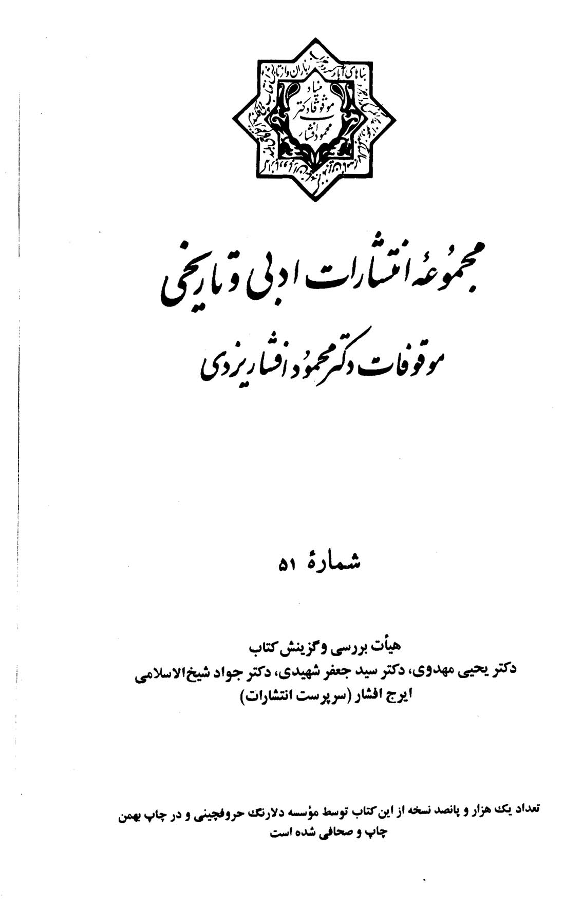 این مجموعه در سال ۱۳۷۳ با حمایت بنیاد موقوفات دکتر محمود افشار یزدی به طبع رسید.