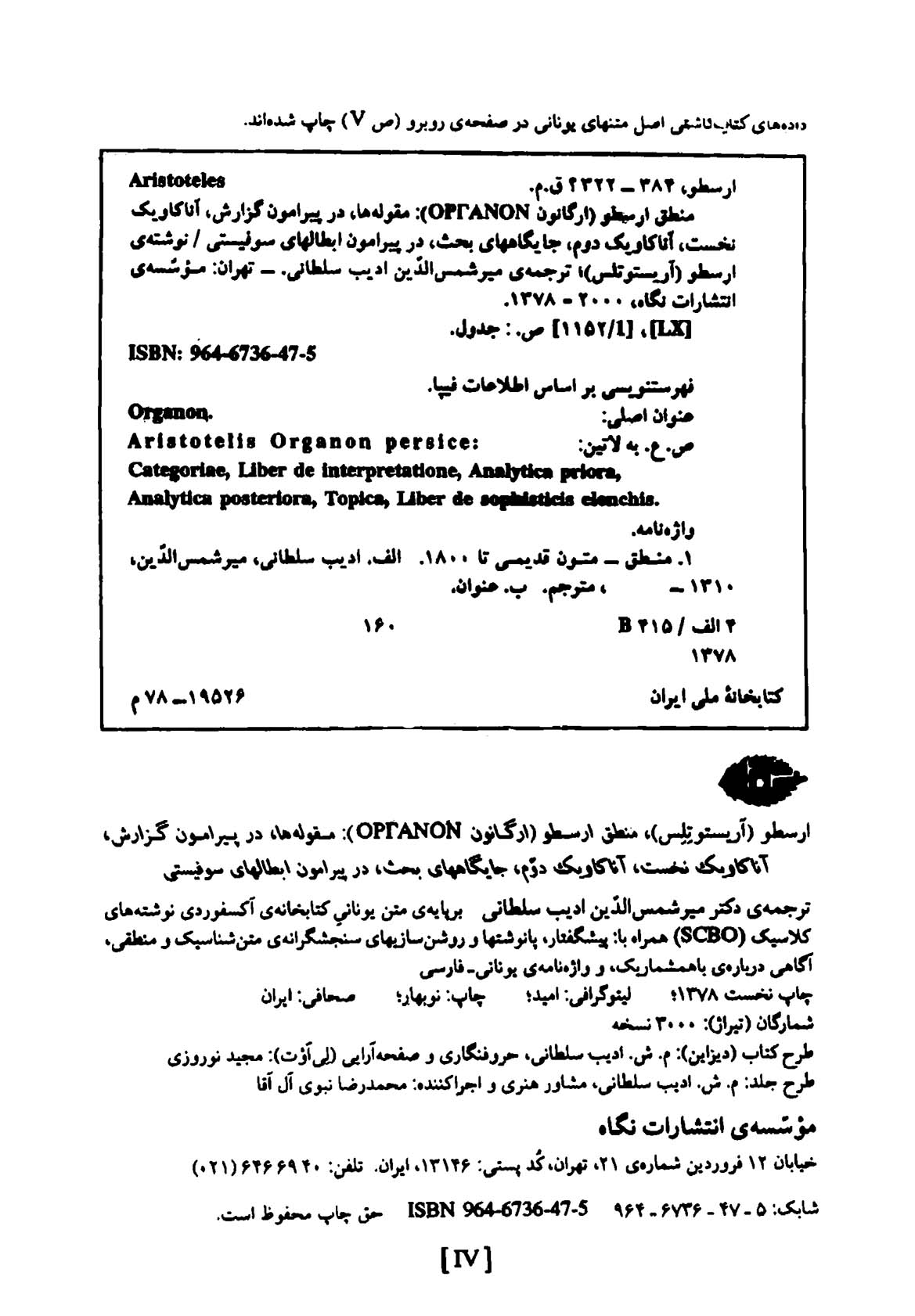 منطق ارسطو (ارگانون). مؤلف: ارسطو. ناشر: نگاه. مترجم: میرشمس‌الدین ادیب سلطانی. زبان: فارسی. سال چاپ: 1390. نوبت چاپ: 4. تیراژ: 1000 نسخه. تعداد صفحات: 1152.