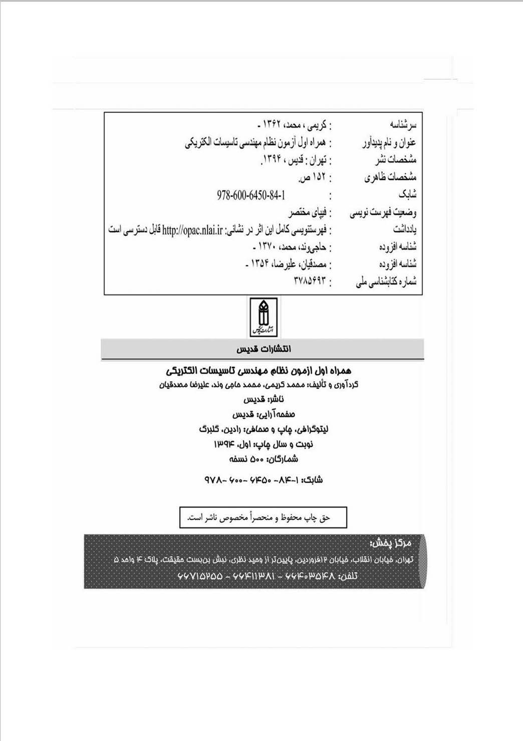 🔖 book_keywords : دانلود فایل pdf همراه اول آزمون نظام مهندسی تاسیسات الکتریکی نوشته محمد کریمی محمد حاجی وند علیرضا مصدقیان
