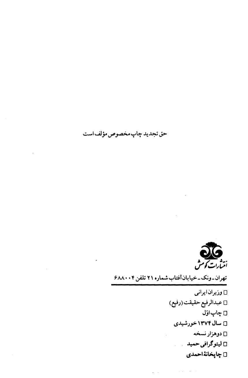 🔖 book_keywords : دانلود فایل pdf وزیران ایرانی از بزرگمهر تا امیرکبیر نوشته عبدالرفیع حقیقت (رفیع)