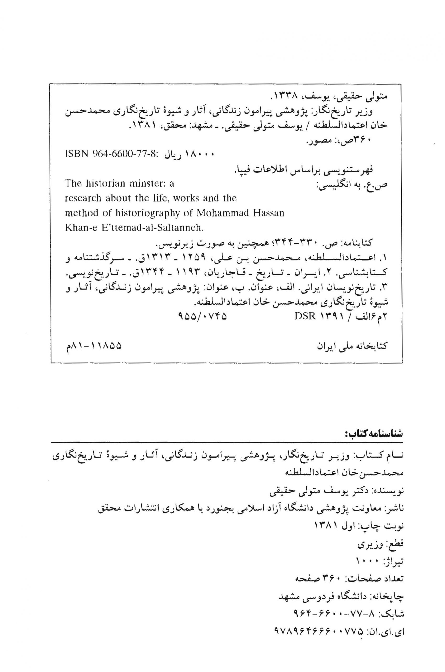وزیر تاریخنگار: پژوهشی پیرامون زندگانی، آثار و شیوه تاریخنگاری محمدحسن خان اعتمادالسلطنه