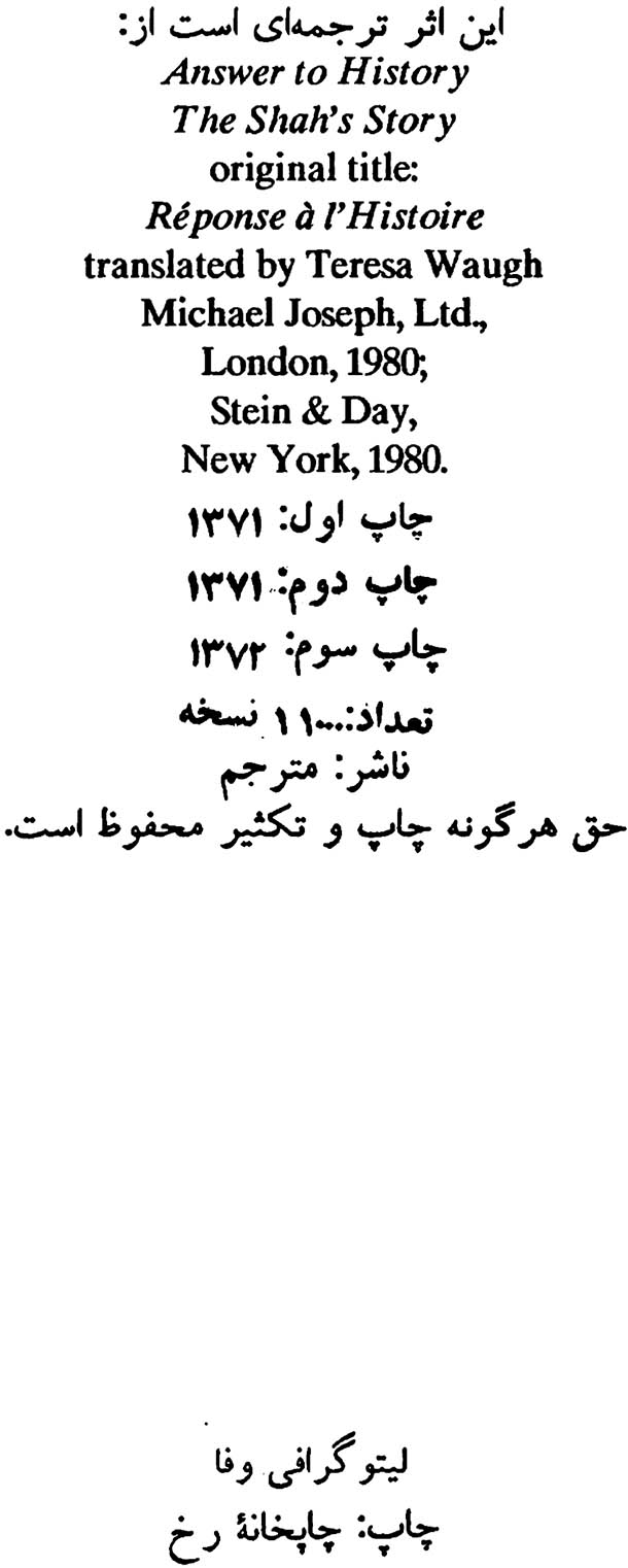 “پاسخ به تاریخ” اثری است از “محمدرضا پهلوی”، شاه سابق ایران، که بر اساس متن اصلی منتشره ی آن در اروپا و آمریکا و به کوشش “شهریار ماکان” گردآوری شده است. “محمدرضا پهلوی” آخرین پیش نویس “پاسخ به تاریخ” را دو روز قبل از مرگش در ۲۷ ژوئیه ۱۹۸۰ به پایان رساند. تکمیل آن به قول خودش “مسابقه با زمان” بود. او توضیح می دهد که چگونه ایالات متحده ، که مدت ها قدرتمندترین کشور جهان بود ، ناگهان اسیر خیالاتی درباره ی ایران شد، همان ایرانی که کمتر فردی در آمریکا چیزی از تاریخ و فرهنگ و ثروت آن می دانست. شاه در بیان روایت شخصی خود ، اظهار می دارد که چگونه ایران به میدان نبرد بین ایالات متحده و اتحاد جماهیر شوروی ، که اهداف خود را بیش از نیم قرن با موفقیت روزافزون دنبال می کرد، تبدیل شد.