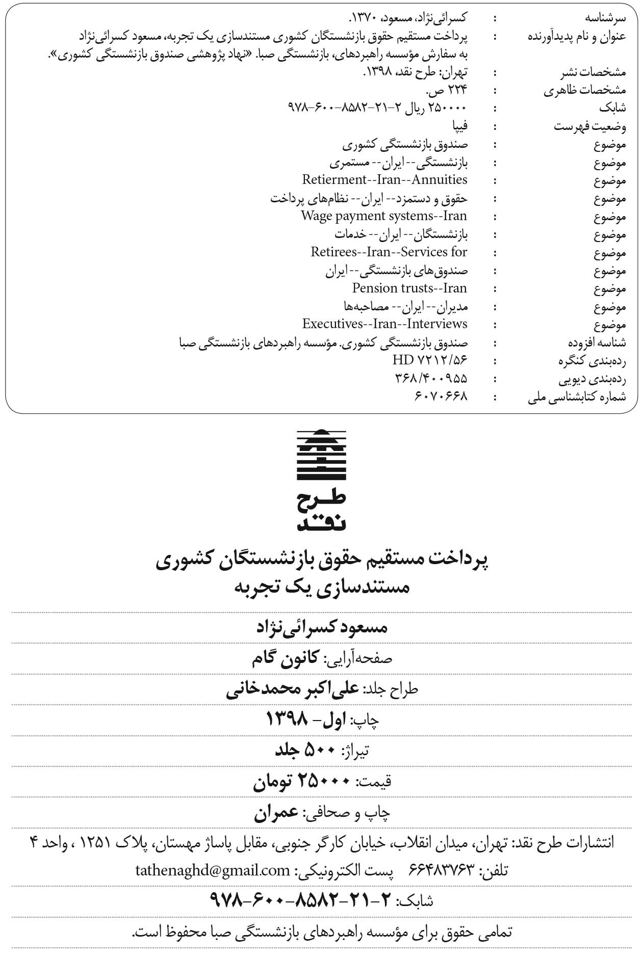 🔖 book_keywords : دانلود فایل pdf پرداخت مستقیم حقوق بازنشستگان کشوری؛ مستندسازی یک تجربه نوشته مسعود کسرائی نژاد