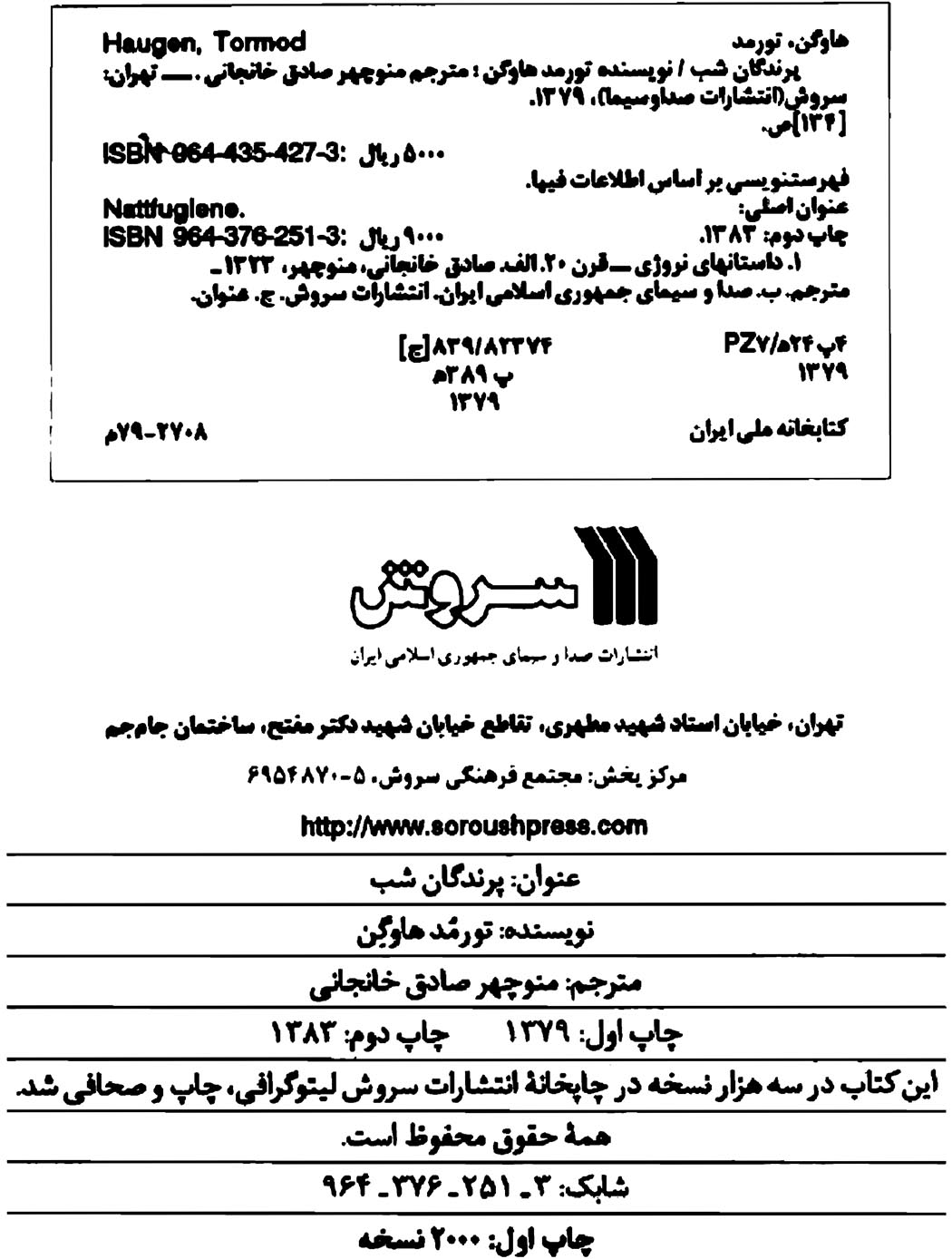 عنوان و نام پدیدآور پرندگان شب‌/ نویسنده تورمد هاوگن‌؛ ترجمه منوچهر صادق‌خانجانی .