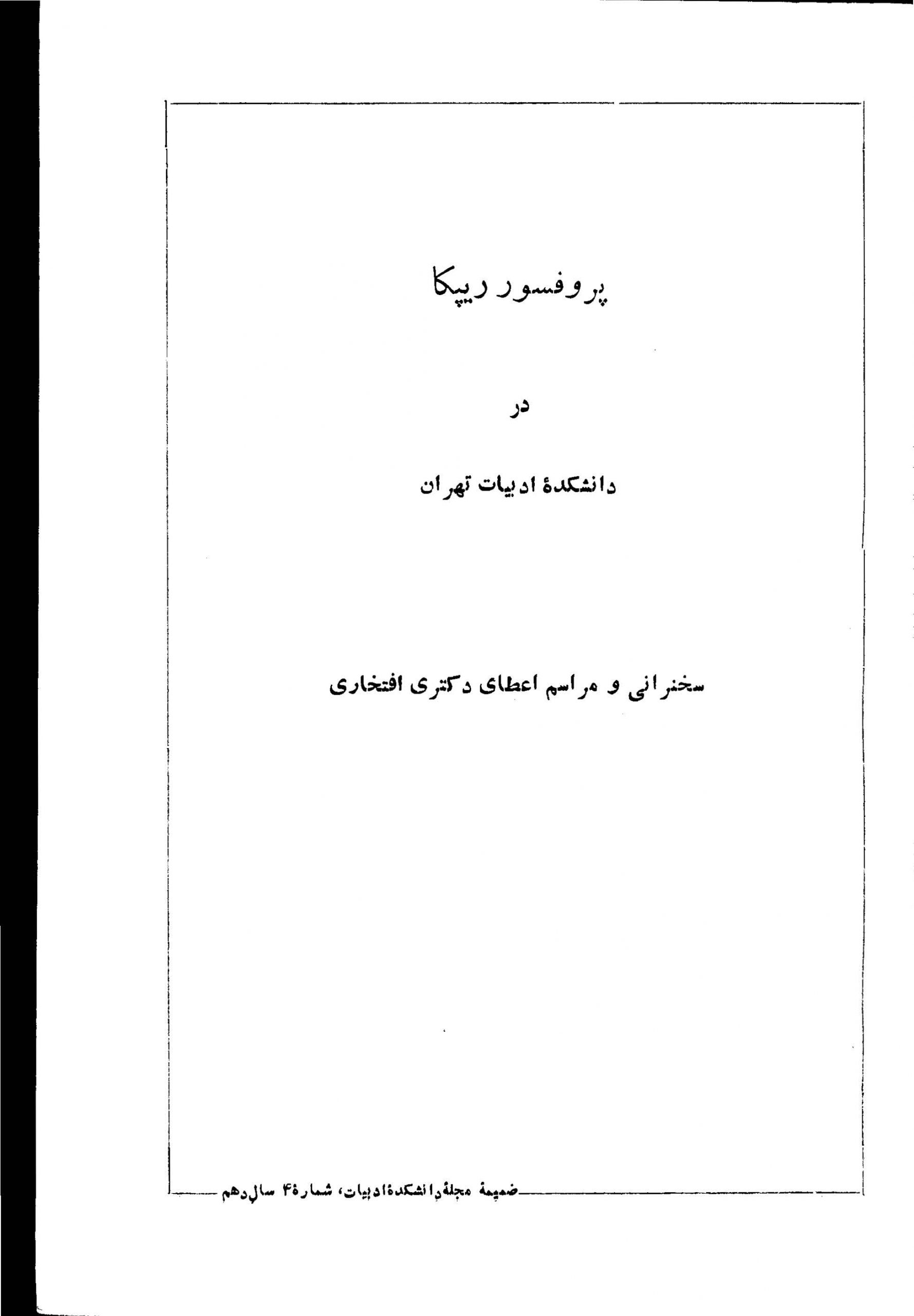 این کتابچه که در ضمیمه مجله دانشکده ادبیات، سال دهم و شماره چهارم منتشر شده، دربرگیرنده متن سخنرانی یان ریپکا در دانشکده ادبیات دانشگاه تهران و مراسم اعطای دکتری افتخاری به اوست.
