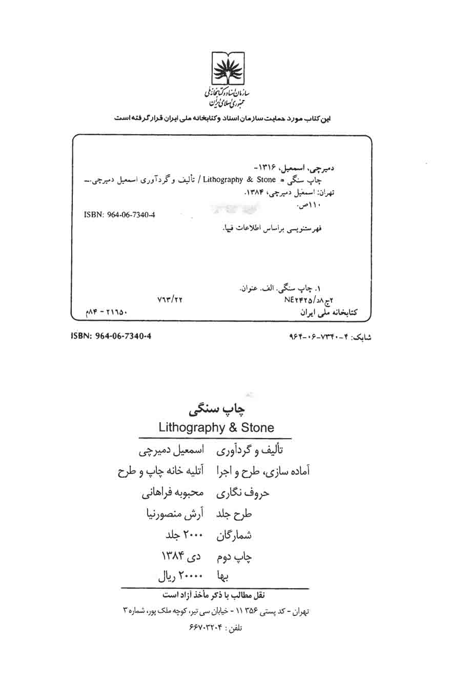 در این کتاب مباحثی درباره چاپ سنگی از قبیل تاریخچه چاپ سنگی، سنگهای مخصوص سنگ چاپ، نگارش و آمادهسازی سنگ چاپ، روش انتقال تصویر به سنگ و … آورده شده است.