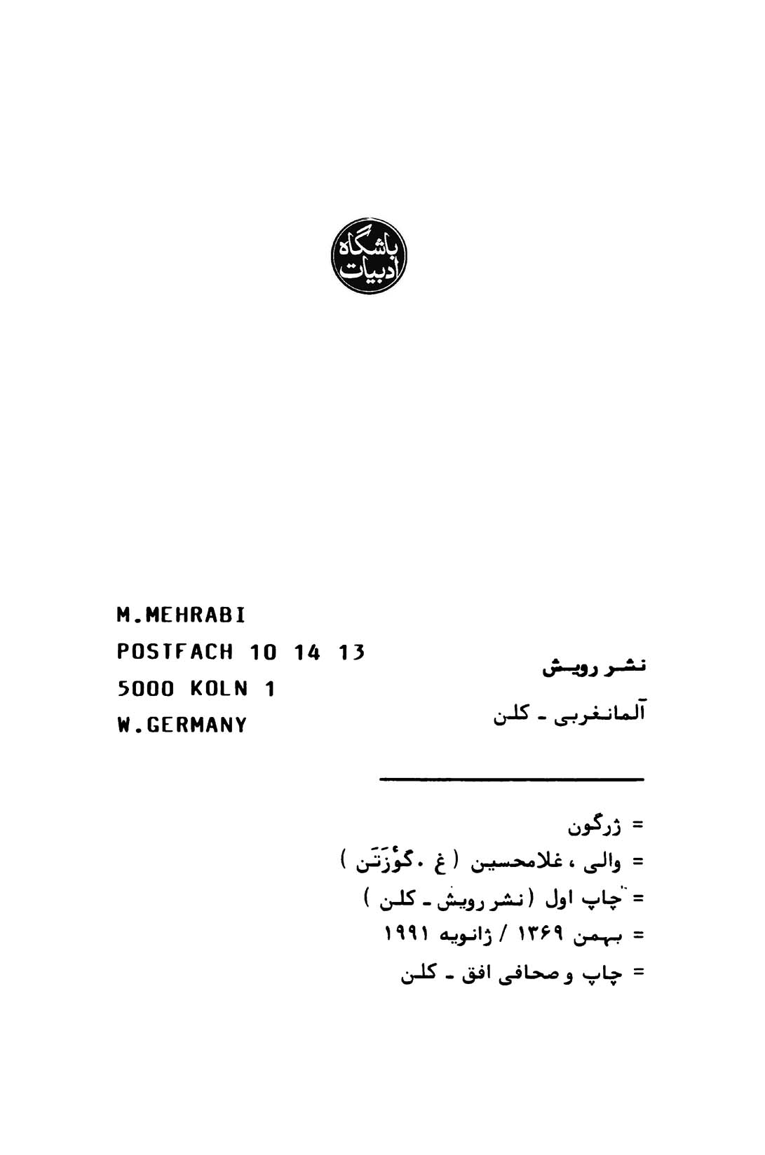 | شناسنامۀ کتاب | ژرگون (یك نمایشنامه و چهار داستان اساطیری)؛ غلامحسین والی (غ. گوزَتَن)، چاپ اول (1369) كُلن ـ آلمان، نشر رویش. 79 صفحه36) |