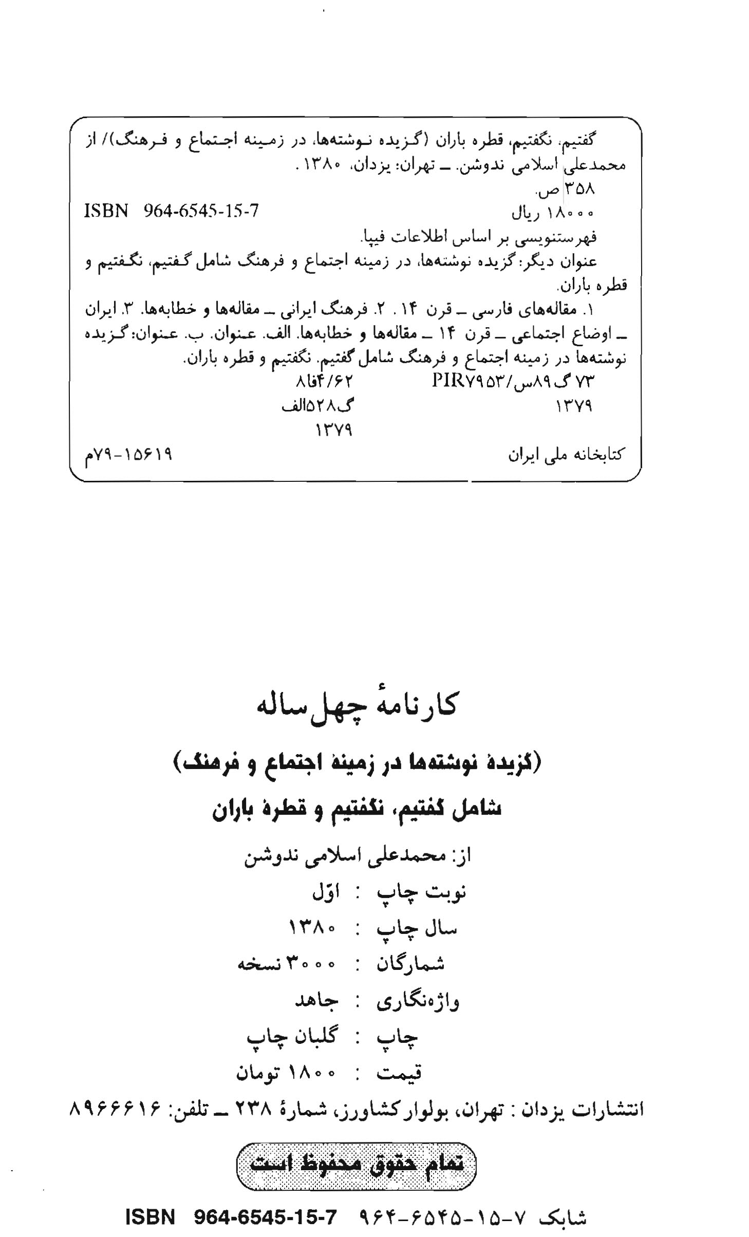 مشخصات نشر تهران‌: یزدان‌، 1380.