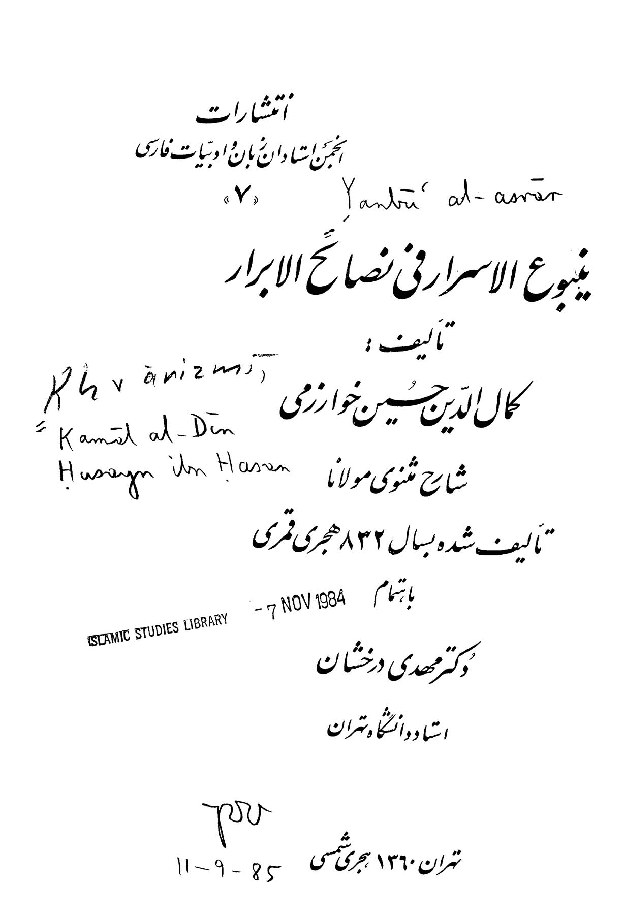 🔖 book_keywords : دانلود فایل pdf ینبوع الاسرار فی نصایح الابرار نوشته کمال الدین حسین خوارزمی ترجمه به اهتمام: مهدی درخشان