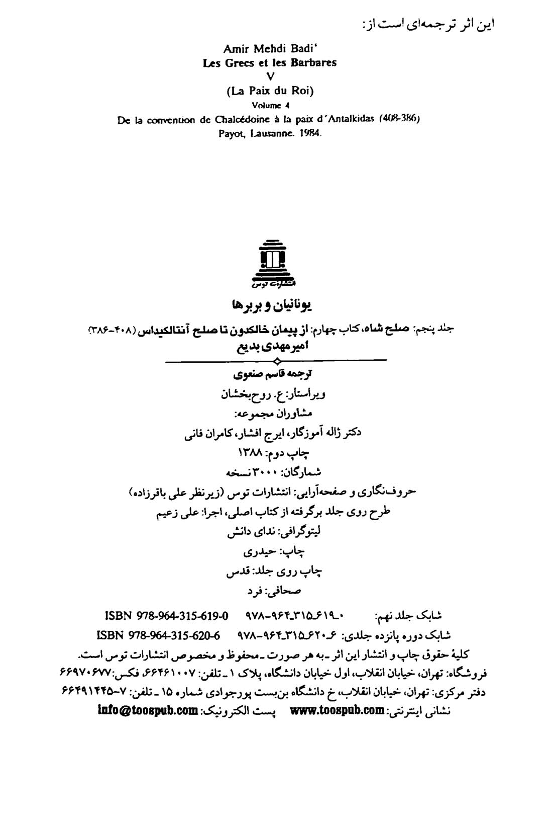 جلد پنجم: صلح شاه، دفتر چهارم: از پیمان کالسدوان تا صلح آنتالکیداس، ترجمه