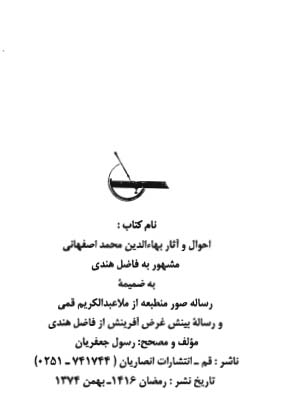 در کتاب حاضر احوال و آثار او بر اساس آگاهیهایی که از منابع مختلف و فهارس خطی به دست داده شده، گردآوری شده است. در دو ضمیمه «صور منطبعه» در پاسخ به کتاب “پنج صیقل” از محبعلی اصفهانی که آن را در رد چهار آئینه فاضل هندی نگاشته بوده و رساله بینش غرض آفرینش در اعتقادات از فاضل هندی تصحیح و آورده شده است.