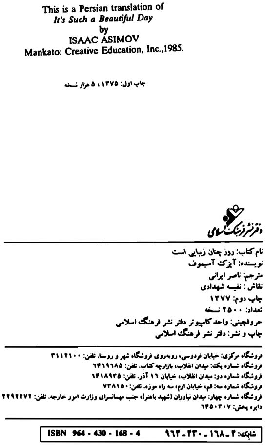 عنوان و نام پدیدآور روز چنان زیبایی است‌/ آیزک آسیموف‌، مترجم ناصر ایرانی‌، نقاش نفیسه شهدادی‌. با گفتاری کوتاه در باب داستان علمی‌/ به قلم مترجم‌