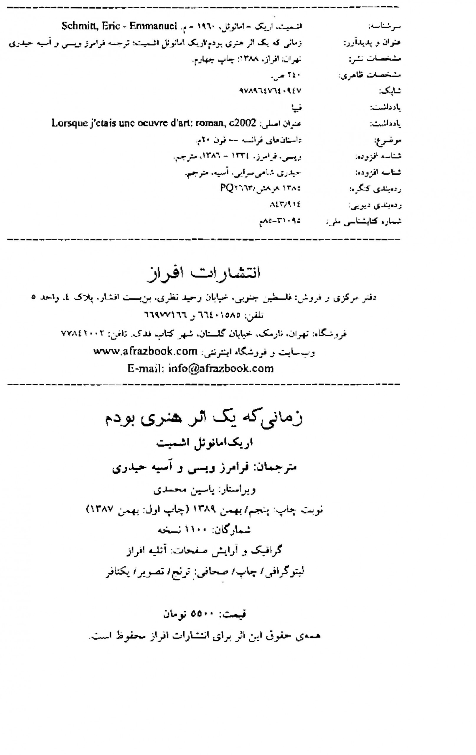 کتاب «زمانی که یک اثر هنری بودم» نوشتهی «اریک امانوئل اشمیت»، ترجمهی «فرامرز ویسی» و «آسیه حیدری» است.