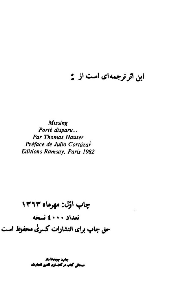 هر چند در آن ایام صدها نفر از مردم شیلی و بسیاری از خارجیان مقیم آن کشور، همه روزه به همین سرنوشت دچار می شدند، با این همه چگونگی مرگ چارلز هورمن و دیگر قربانیان این کشتار پایان ناپذیر، نمی توانست به بوته فراموشی و بیخبری عمومی سپرده شود. همسر و پدر مقتول بی درنگ به جستجوی گمشده شان پرداختند و در حقیقت رویدادها و نتایج تحقیقات آن دو بود که چند سال بعد توماس هاوزر، وکیل دادگستری نیویورکی را بر آن داشت تا براساس شهادت کسانی که در این ماجرا دست داشتند و همچنین تحقیقات شخصی اش، این کتاب را بنویسد. به تدریج که خواننده این کتاب را ورق می زند، او نیز مانند پدر چارلز هورمن عناصر لازم را برای کشف واقعیت بدست می آورد و با ترس و نفرت درمی یابد که هرچند بازداشت و اعدام این روزنامه نگار جوان بدست کودتاچیان رژیم پینوشه صورت گرفت، ولی علت قتل او کوچکترین ارتباطی با سیاست داخلی شیلی نداشت؛ به عکس نابودی چارلز مولود یک ضرورت خارجی بود: می بایست به هر قیمت شده شخصی که همدستی آمریکاییان با کودتاچیان را برحسب تصادف کشف کرده بود، از بین برد. در واقع اعدام چارلز هورمن از سوی هموطنانش درخواست و تدارک دیده شده بود…
