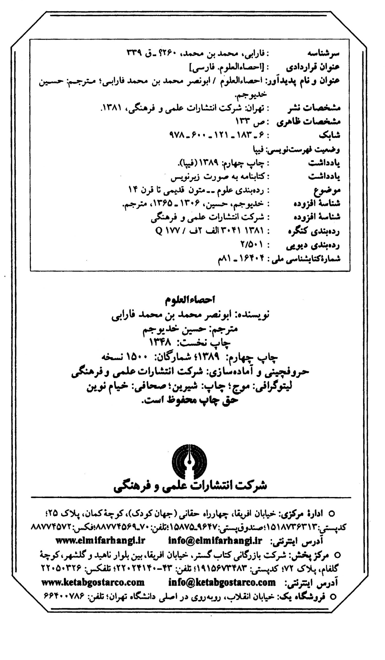 🔖 book_keywords : دانلود فایل pdf احصاء العلوم فارابی نوشته محمدبن‌محمد فارابی ترجمه حسین خدیو جم