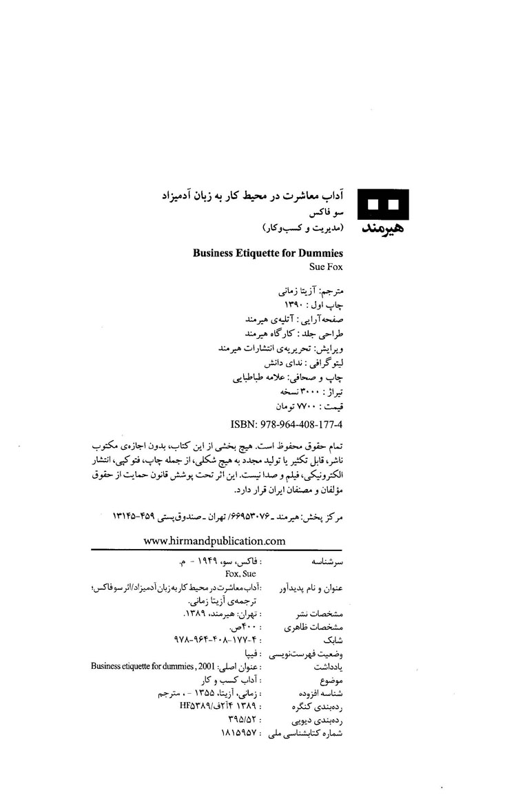 عنوان و نام پدیدآور آداب معاشرت در محیط کار به زبان آدمیزاد/ اثر سو فاکس؛ ترجمه‌ی آزیتا زمانی.